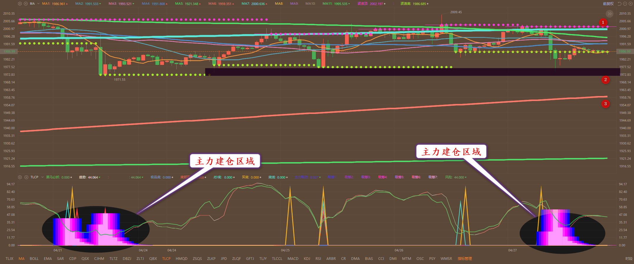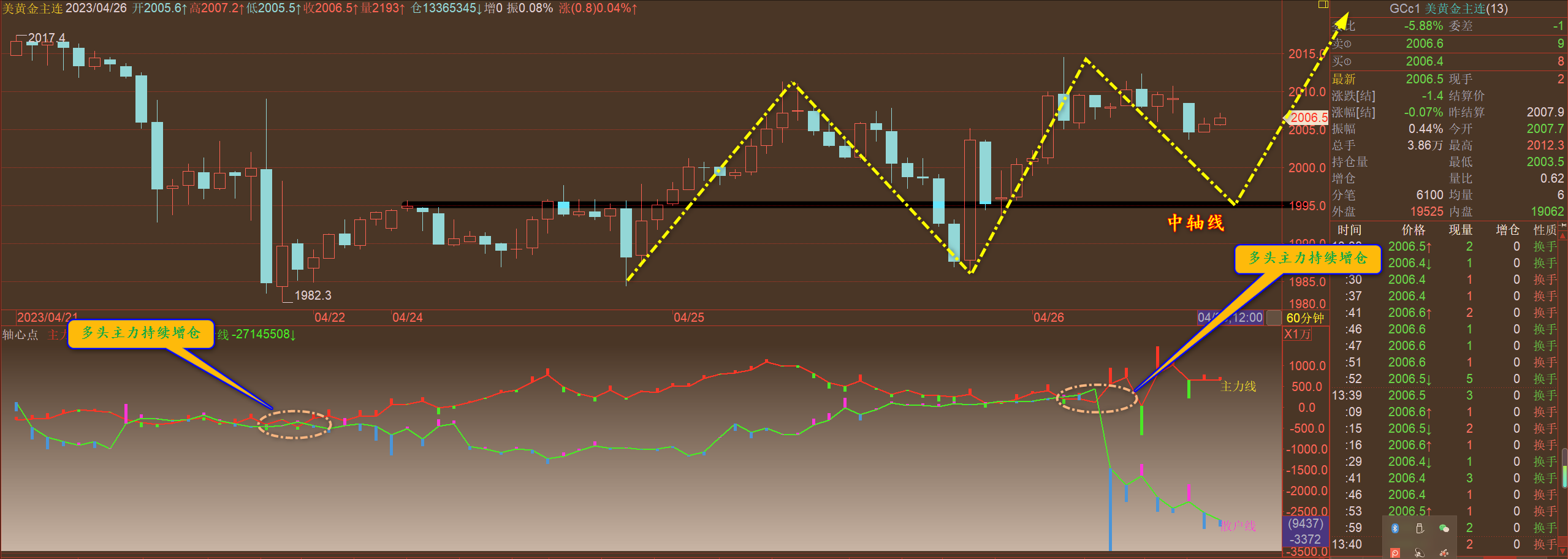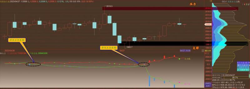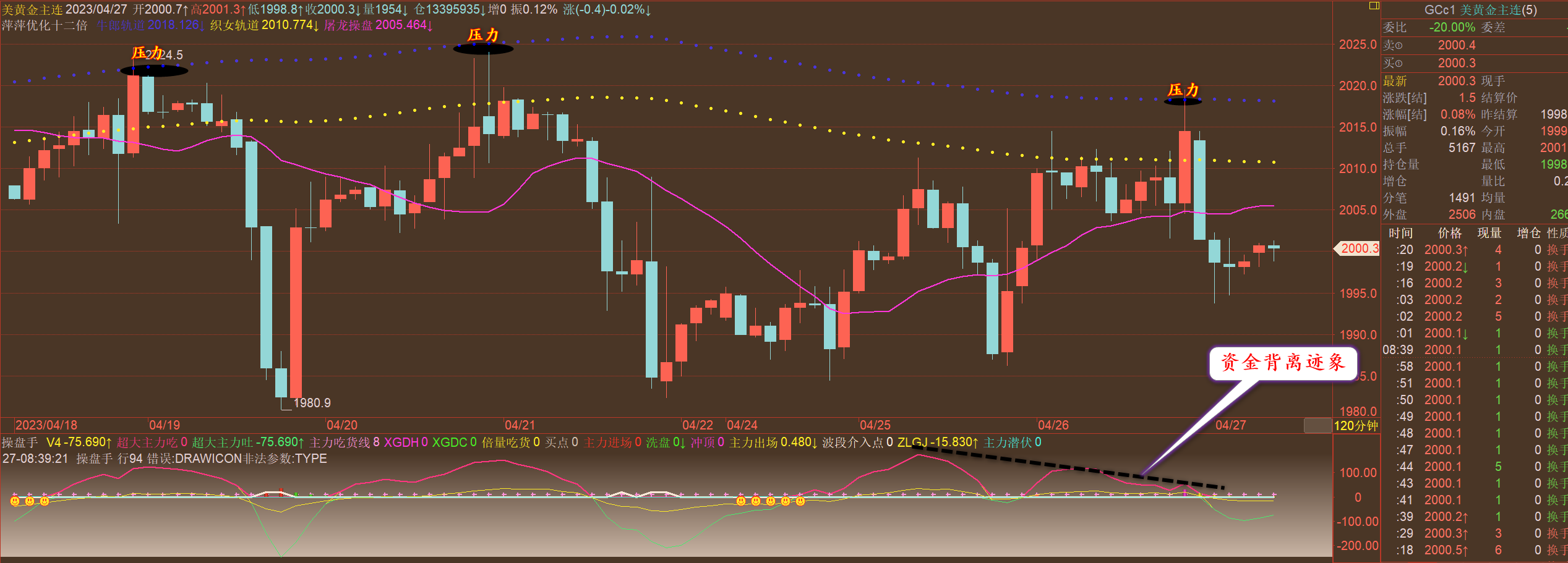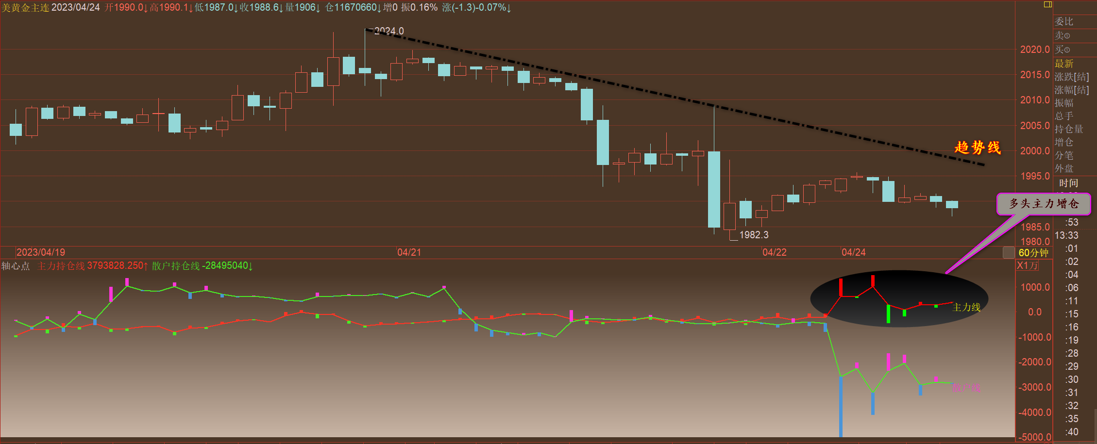 通过对黄金小时图解析得知,昨日行情如期到达下方1984一线止跌反弹和上方2005一线冲高回落,从下方的附图我们可以清楚的看到昨日昨日在下方出现了多头主力增仓介入形成一波小幅反弹上涨,到达上方压力位冲高回落,今日早盘再次出现多头主力增仓动作再次形成一波小幅反弹上方的压力依然是昨日的高点附近,一旦放量突破将