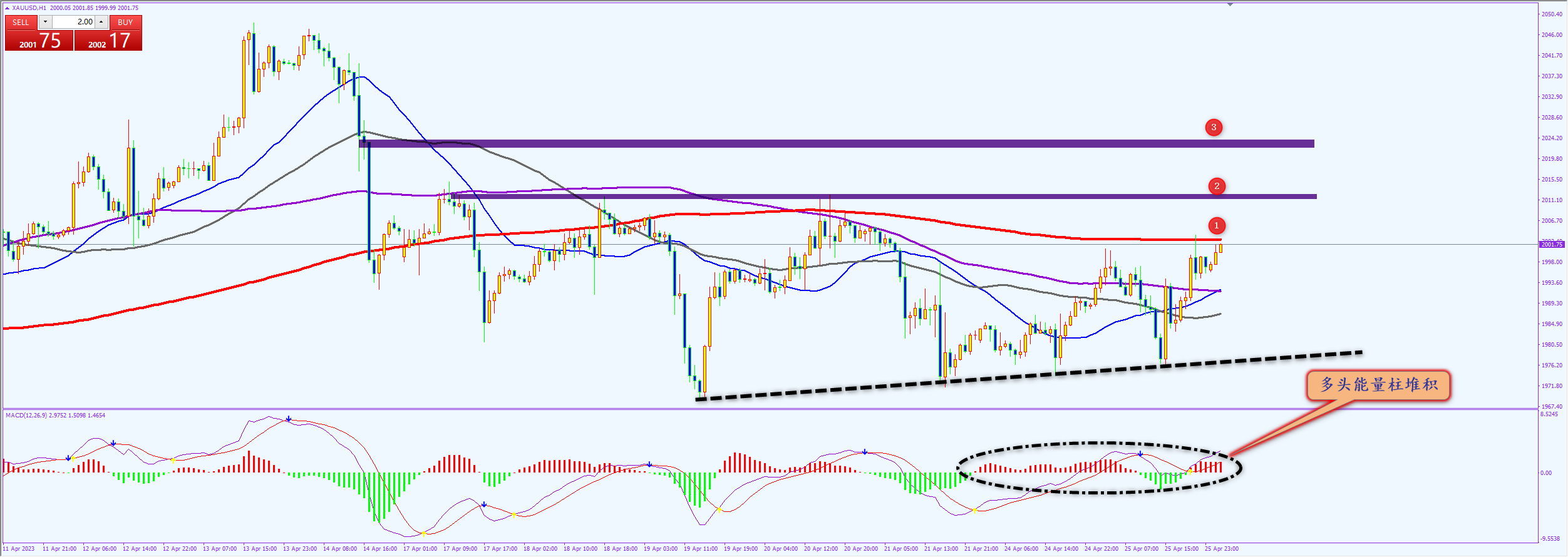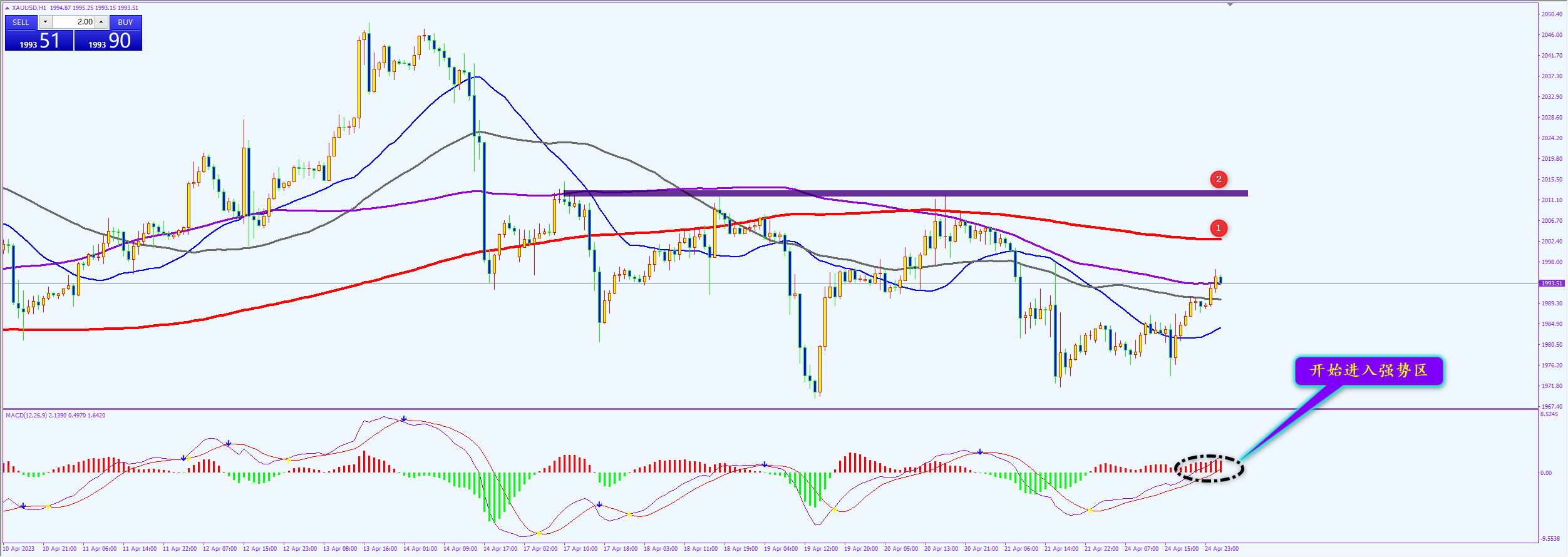 通过对黄金小时图解析得知,昨日行情如期先跌后涨形成震荡上行走势目前已经站上120均线有进一步向1号均线靠近,从下方ACD也可以清楚的看到已经介入零轴上方运行多头能量柱处于温和放量的状态说明上涨的动能比较强短期上方我们重点关注12号的压制即可一旦站上2号(2015)将会形成加速上涨的状态,短期下方重点关注下方198