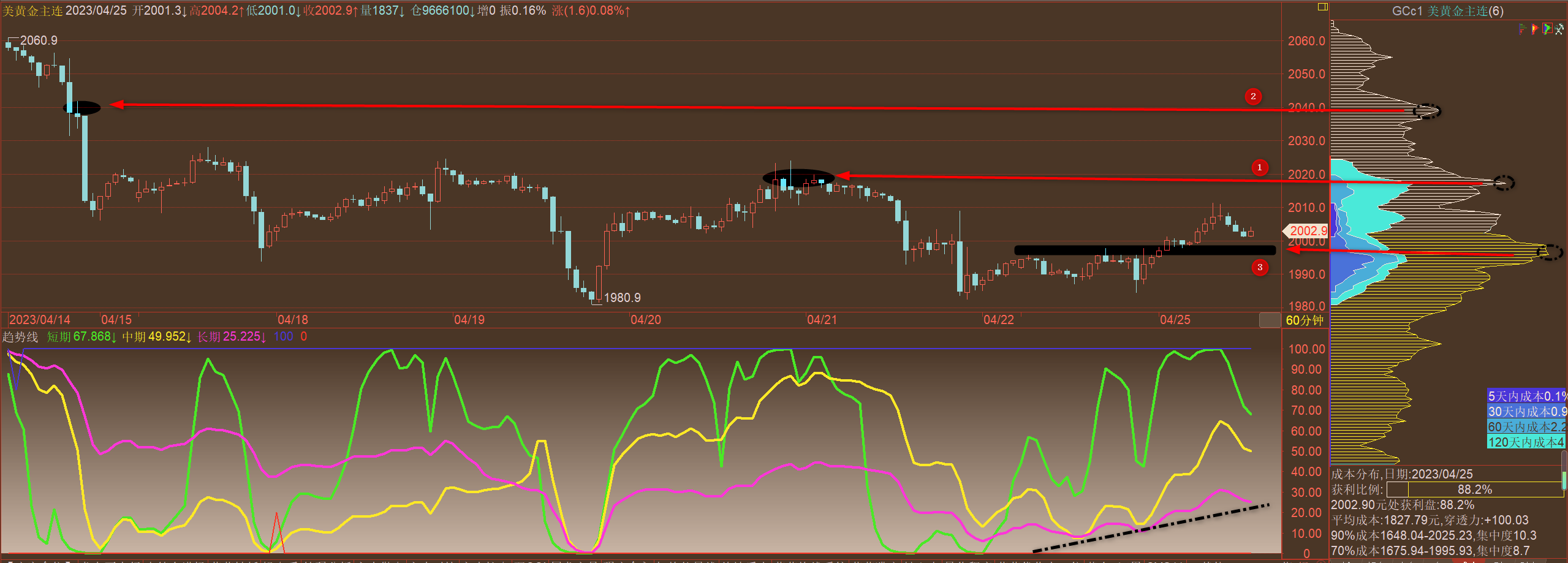 通过对黄金小时图解析得知,自从黄金从昨天晚上反弹以来,目前有所回落从右边的成本分布图我们可以清楚的看到在下方3号支撑位有大量的筹码集中什么有一定的支撑作用,上方12号的筹码峰值的位置是压力,我们从下方的附图可以清楚的看到目前长期资金还没有真正的走强还在弱势区运行,整体说明行情还需要进行震荡调整做蓄势