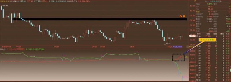 通过对原油小时图解析得知,昨日行情如期冲高回落,到达下方76.50一线止跌反弹,从下方的附图我们可以清楚的看到多头主力在昨天晚上大量增仓介入空头主力大量出逃,说明在底部区域有大资金进仓行情将会进一步的反弹,上方我们继续关注79.20一线的压制一旦放量突破将会继续加速拉升,下方我们继续关注76.60和75.60的支撑