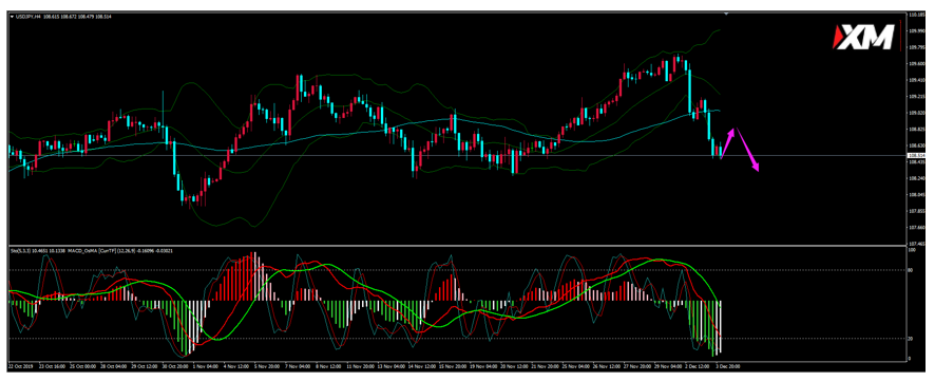 1H昨日触及MA20一线空头增强,今日上方关注108.80-90一线阻力,短线震荡偏空,目标关注日线前支撑,下破方可延续。