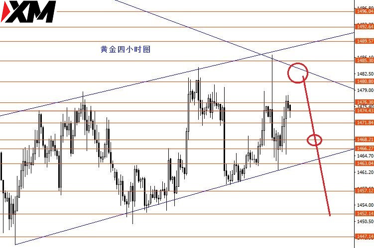 黄金上周仍然在上升通道里运行,周图收阳柱。从图形来看,上方1485区域压力较重,在没成功上破前,黄金向下运行的概率较大,本周继续关注上方1485强阻力区域,若成功站稳1489上方后再重新分析。今日操作建议:1481-1484区域做空,止损1490,目标看向1468,成功下破后再看向1457和1452区域。控制仓量,严格止损。