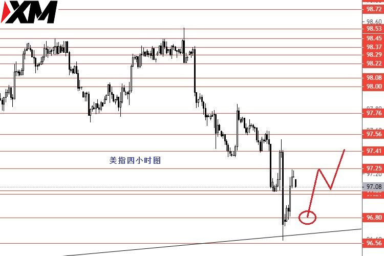 美元指数上周震荡下行,最低96.60区域后向上反弹。从图形来看,美指仍然较弱,但本月后市在96.60没成功跌破前,留意震荡或反弹行情出现,今日操作建议:96.80区域做多,止损96.40,目标看向97.40和97.75区域。控制仓量,严格止损。