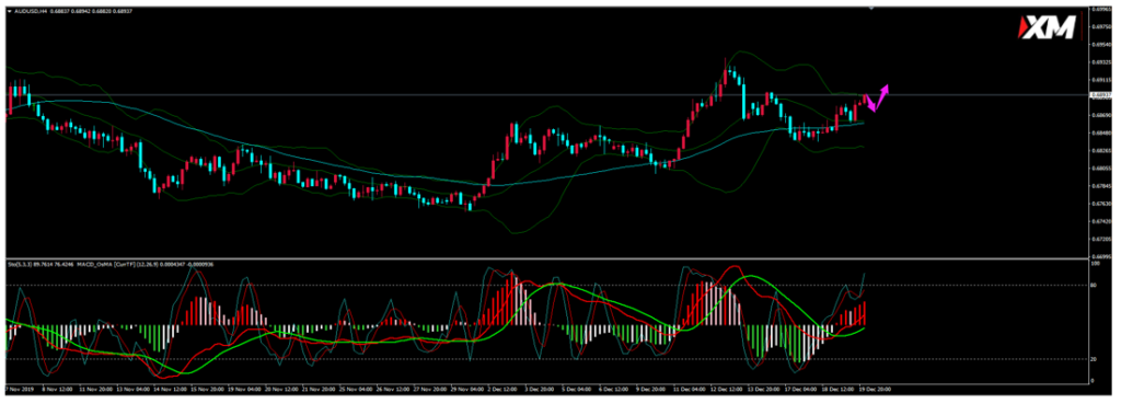 4H昨日突破0.6860一线偏多,目前短期均线偏上,MACD零轴上方金叉运行,短线有维持震荡上行之势。