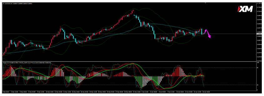 4H昨日失守0.6920一线转入震荡格局,目前短期均线拐头向下,MACD零轴附近死叉运行,短线处于多空交接地带面临方向选择。