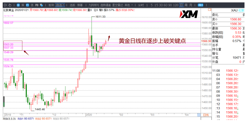 黄金回日内在1557上方有偏低多机会,偏多运行。关注1560/1559一带多机会,止损1555,目标1565-1568有效突破后继续往1572-1575上涨。