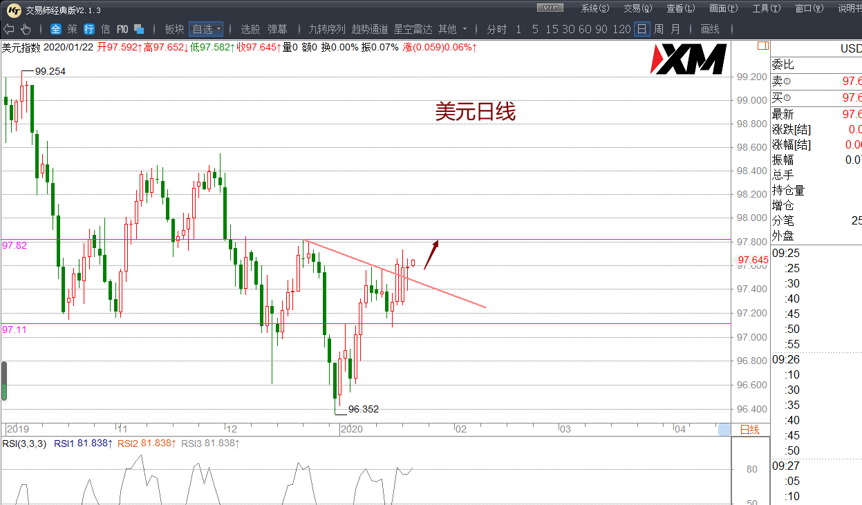 美元97.45上方日线偏多,回踩97.45/97.50附近可短多,关注前方97.80关键压制区。