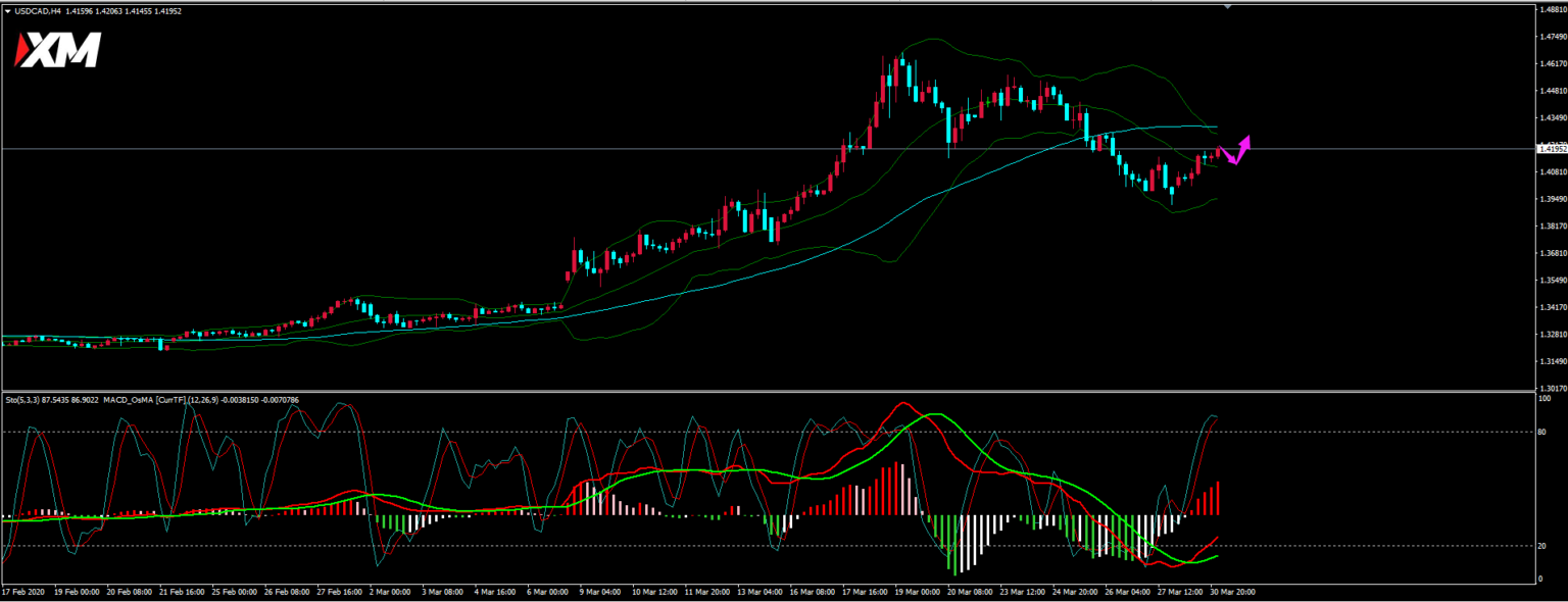4H昨日突破1.4070一线转入震荡格局,目前短期均线偏上,MACD零轴下方金叉运行,短线有维持震荡上行之势。