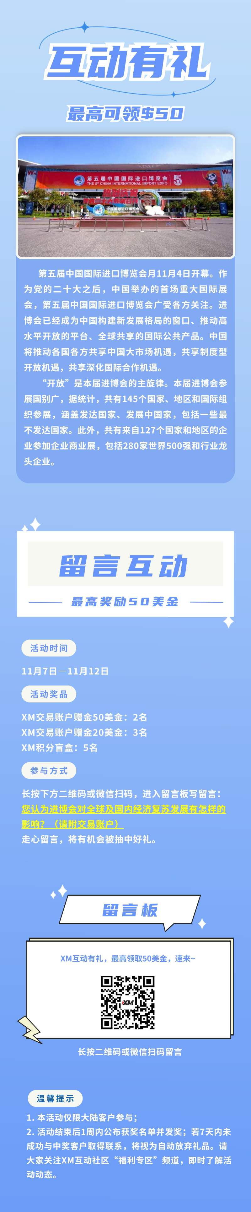微信扫一扫海报最下方的二维码,参与XM互动留言,最高领取$50赠金,速来~