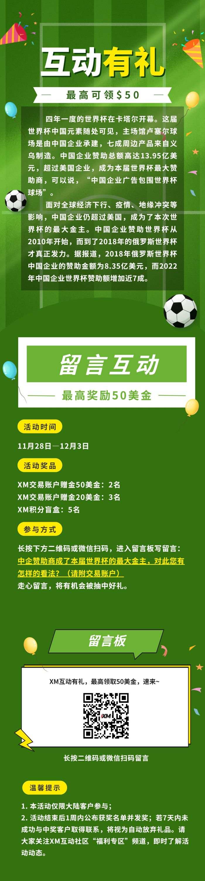 微信扫一扫海报最下方的二维码,参与XM互动留言,最高领取$50赠金,速来~