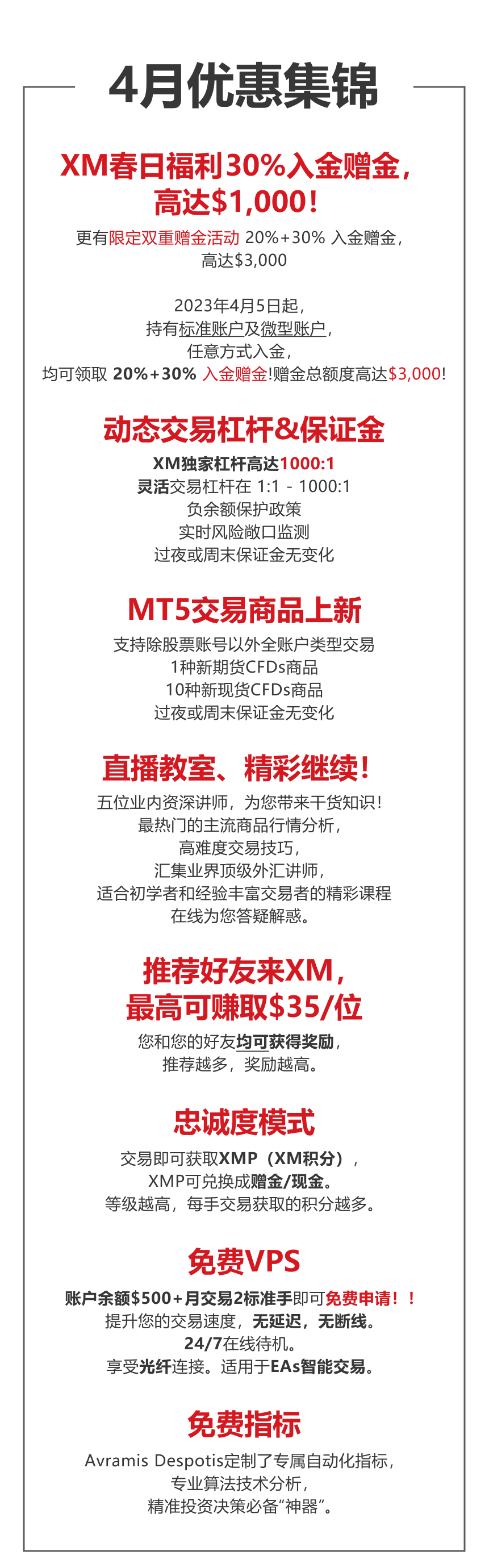 春季赠金,福利来袭!2023年4月5日 - 2023年4月28日,任意方式入金可领取30%赠金!金额领取高达 $1,000!更有限定双重赠金活动20% + 30% 入金赠金,4月赠金总额高达$3,000!
