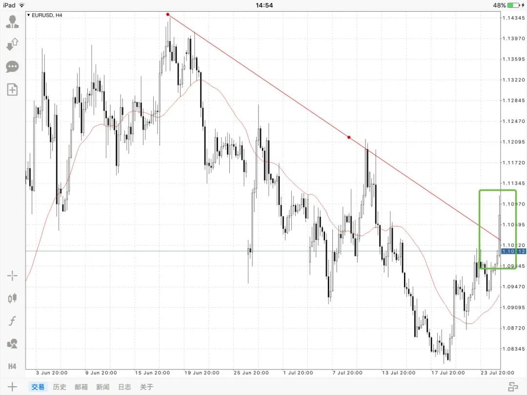 当一根长期向下的趋势线被突破,可以轻仓做多,或者空单平仓。