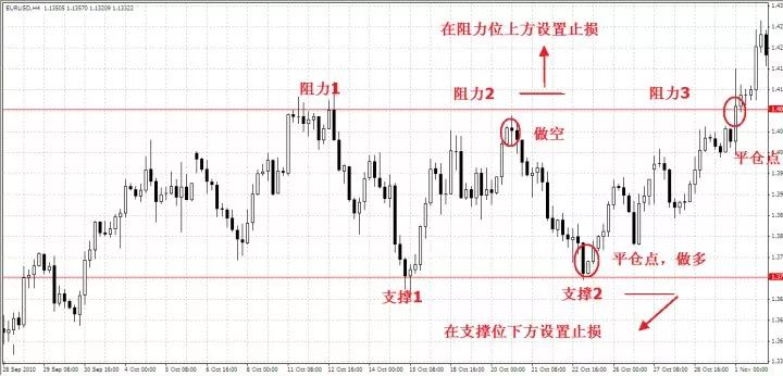 在支撑区设立多头止损,在阻力区设立空头止损,扮演支撑区和阻力区的技术分析形态有:盘整区上下边缘,波峰波谷,趋势线,双顶双底,头肩底头肩顶等