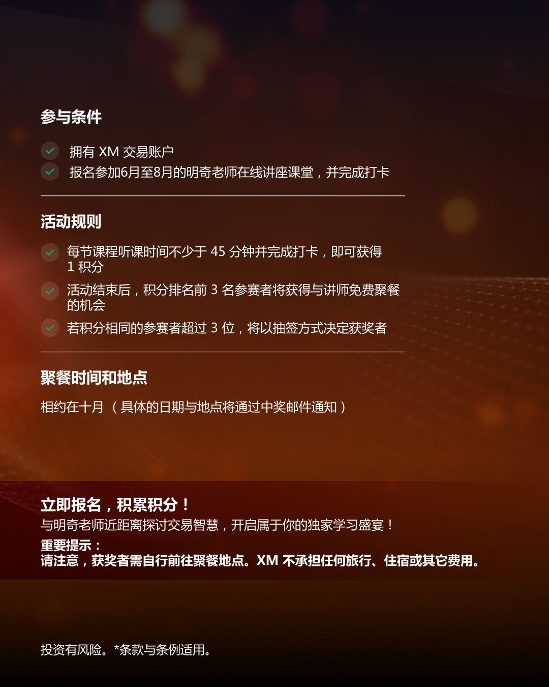 2025年6月至8月期间,只要参与明奇老师的在线直播课程,并完成课程打卡,即有机会赢取与老师面对面共进晚餐的宝贵名额!