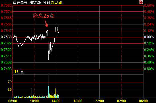 澳洲联储宣布降息之后,澳元/美元短线下跌50点,随后扳回全部跌幅,因为降息早已被市场计入价格,所以短线震荡过后重回既定轨道。