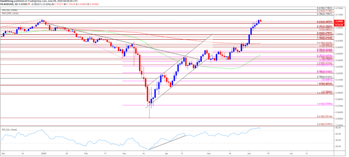 与此同时,澳元/美元的RSI指标处于超买区域,汇价近期上涨,将这一震荡指标推升至2018年以来的最高水平。但是,若RSI指标跌破70,则可能在未来几天中形成如教科书一般标准的看跌信号。