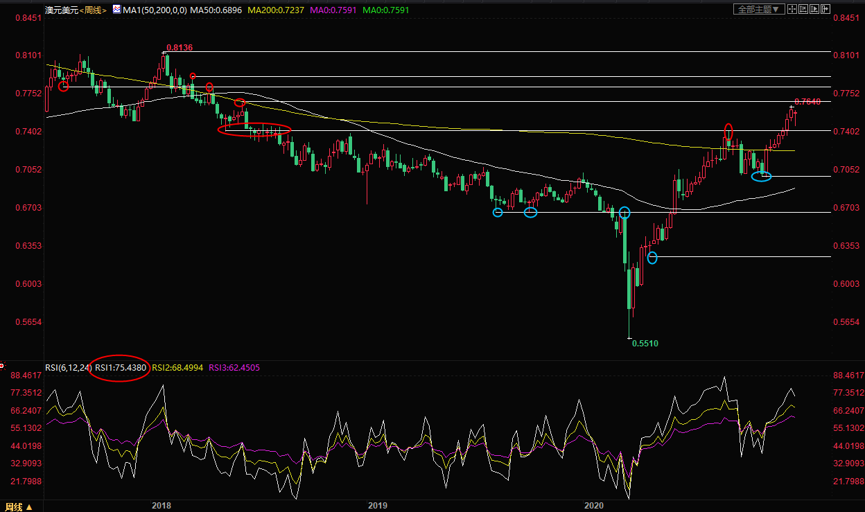 若澳元兑美元进一步下跌,接下去的支撑位就是2019年末的阻力位0.6650,接下去的支撑位是0.6230。澳元兑美元2020年的低位在0.55左右,但2021年不太可能跌破这一位置。