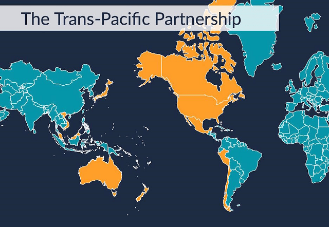 如下图黄色区域所示,太平洋伙伴关系(TPP)贸易协定覆盖了全球40%的经济
