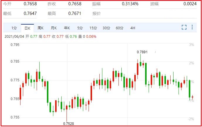 周五,美国将公布5月份非农就业报告。预计美国5月份新增就业岗位64.4万个,而失业率预计将从此前的6.1%升至5.9%。这两个数据若意外上升,可能进一步提振美元需求,因为这将加大美联储收紧货币政策的压力。汇价现报0.7662,涨幅0.03%。