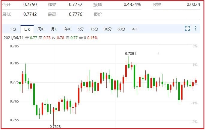 此次强劲的数据出炉后美元指数意外下跌,然后回升,欧元正好相反,欧洲央行决定第三季显著加快紧急抗疫购债计划的购债步伐,拉加德也表示通胀是暂时的,随着暂时性因素逐渐消失,通胀率将随之下降。汇价现报0.7759,涨幅0.08%。