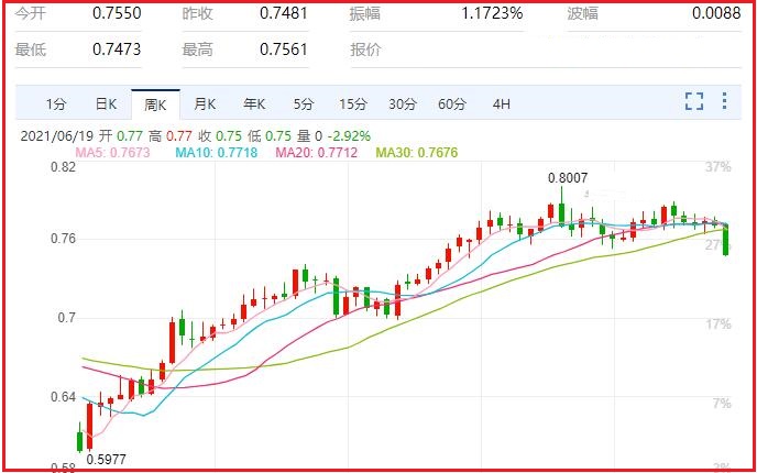 1.澳元/美元货币对汇率本周跌幅2.91%,振幅3.18%,最高0.7725,最低0.7480,收于0.7480,周线收一长阴线;