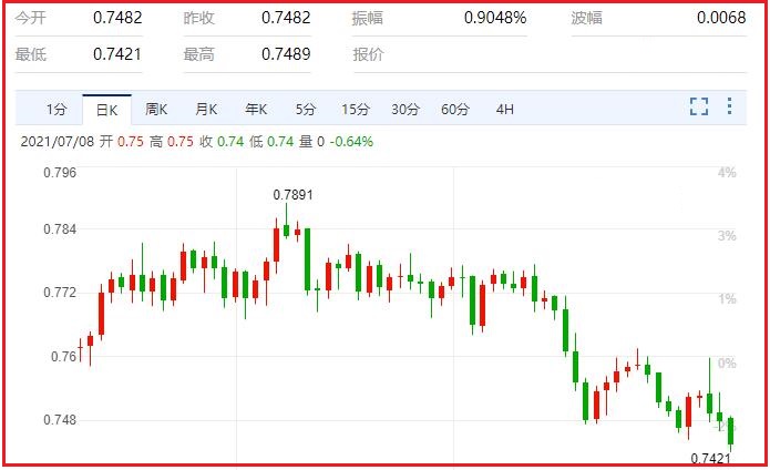 2.澳元/美元一直在急剧下跌,该货币对料跌至0.7445,然后可能展开反弹。一旦有效跌破0.7445,那么澳元/美元可能测试0.74;