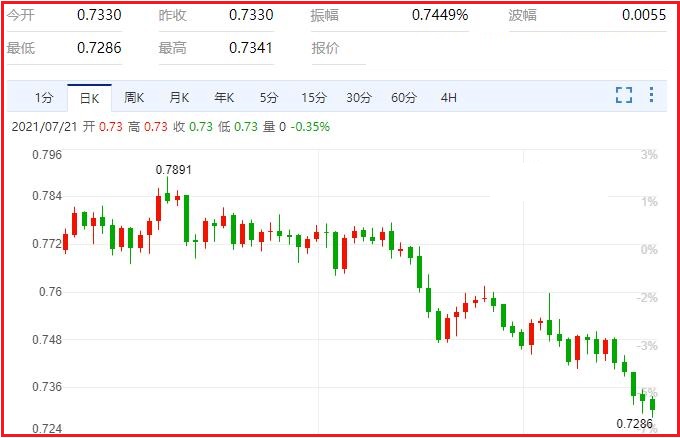 1.澳元昨日震荡下行,险守0.7300关口,日线收一阴线;
