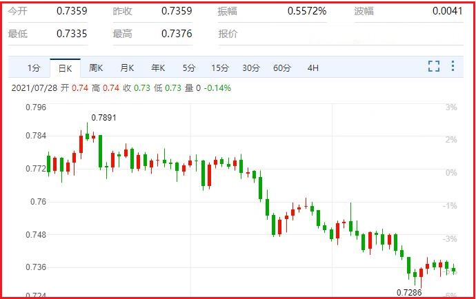 美元已经升值超过一个月,反映出市场预期美国经济复苏增强,将促使美联储缩减货币支持以抑制通胀升温。但解封后,新冠Delta变种毒株蔓延造成确诊人数反弹,促使经济展望蒙上阴霾。Western Union资深市场分析师Joe Manimbo表示,美元在夏季大涨,他认为美联储带来的事件风险,足以促使部分美元多头获利了结。汇价现报0.7351,跌幅0.11%。