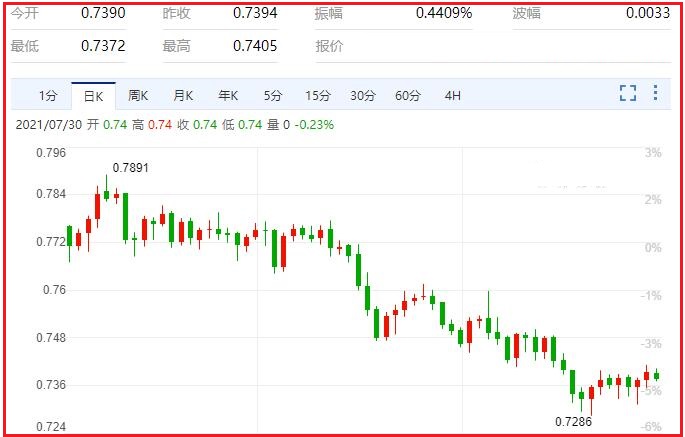 鲍威尔本周早些时候称,美国经济距离美联储稳定物价和最大限度就业的双重目标“进一步取得实质性进展”还有很长的路要走。他解释说,在劳动力市场方面还有一些理由,认为离实现最大就业目标还有一段路要走,希望看到一些强劲的就业数据。他也补充道,由于德尔塔变种病毒的传播,新冠肺炎病例的增加可能不会对经济复苏产生重大影响。针对美元走势,由于美联储没有透露错缩减购债的信号,且鲍威尔警告就业和通胀尚未取得“实质性的进一步进展”,再加上美国二季度GDP远低于预期,或证实经济见顶的预期,美元持续遭遇抛售……汇价现报0.7379,跌幅0.22%。