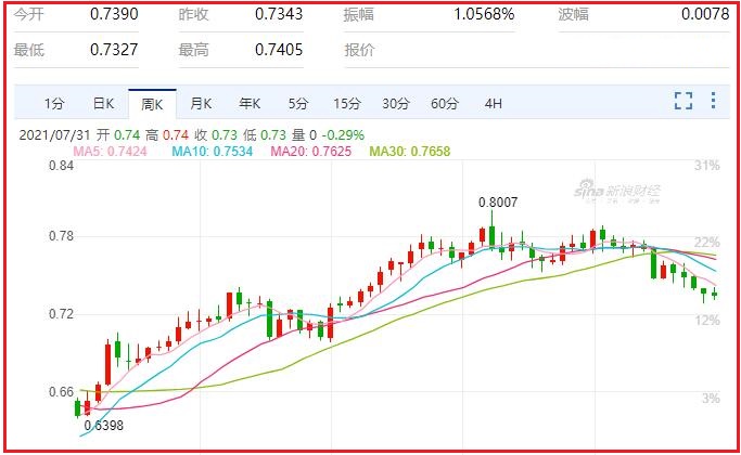 1.澳元/美元货币对汇率本周跌幅0.31%,振幅1.21%,最高0.7413,最低0.7324,收于0.7344,周线收一小阴线;