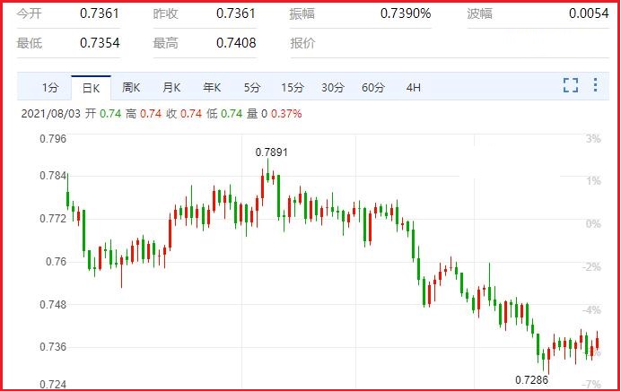 美国定于周五公布7月非农就业报告。市场预期美国7月非农就业人数将将增加92.5万人,高于6月份的85万。美国7月失业率料自5.9%下滑至5.7%。分析师指出,假如非农报告强于预期,这可能会引发美元走强。另一方面,一旦非农报告较预期更加糟糕,美元走势可能进一步回调。汇价现报0.7389,涨幅0.34%。