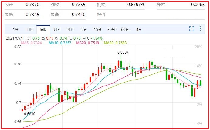 1.澳元/美元货币对汇率本周跌幅1.34%,振幅1.60%,最高0.7465,最低0.7346,收于0.7353,周线收一中阴线;