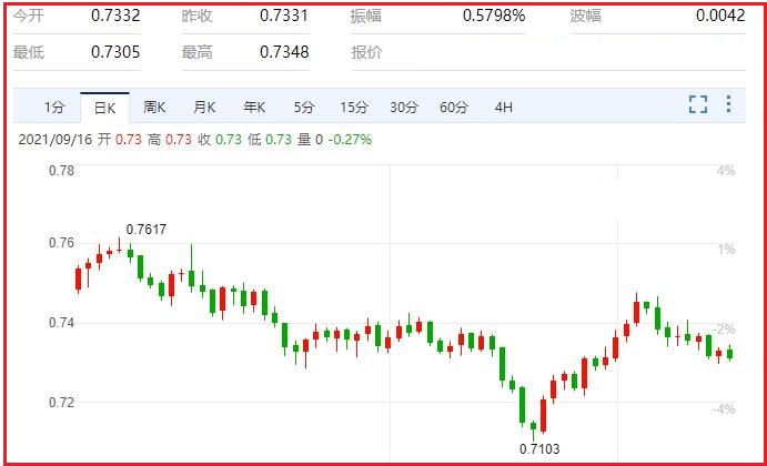 目前不要指望澳元会出现火箭式的大幅上涨,其还是正处于盘整之中。最近的9月7日澳大利亚储备银行(RBA)政策会议暗示,即使不是明年2月,缩减计划也将延长到11月。行长菲利普·洛重申,他预计2024年之前不会加息。澳大利亚央行行长洛威明确质疑市场对澳大利亚央行在2022年和2023年初加息的预期,并重申在2024年之前加息的条件可能不会具备。汇价现报0.7314,跌幅0.28%。