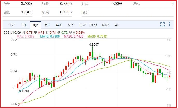 1.澳元/美元货币对汇率本周涨幅0.60%,振幅1.51%,最高0.7337,最低0.7227,收于0.7308,周线收一小阳;
