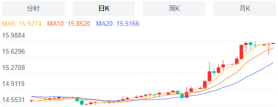 处在15.71 附近的200 周期指数均线构成强支撑,然后汇价整理于 15.90 附近的 20 周期指数均线。