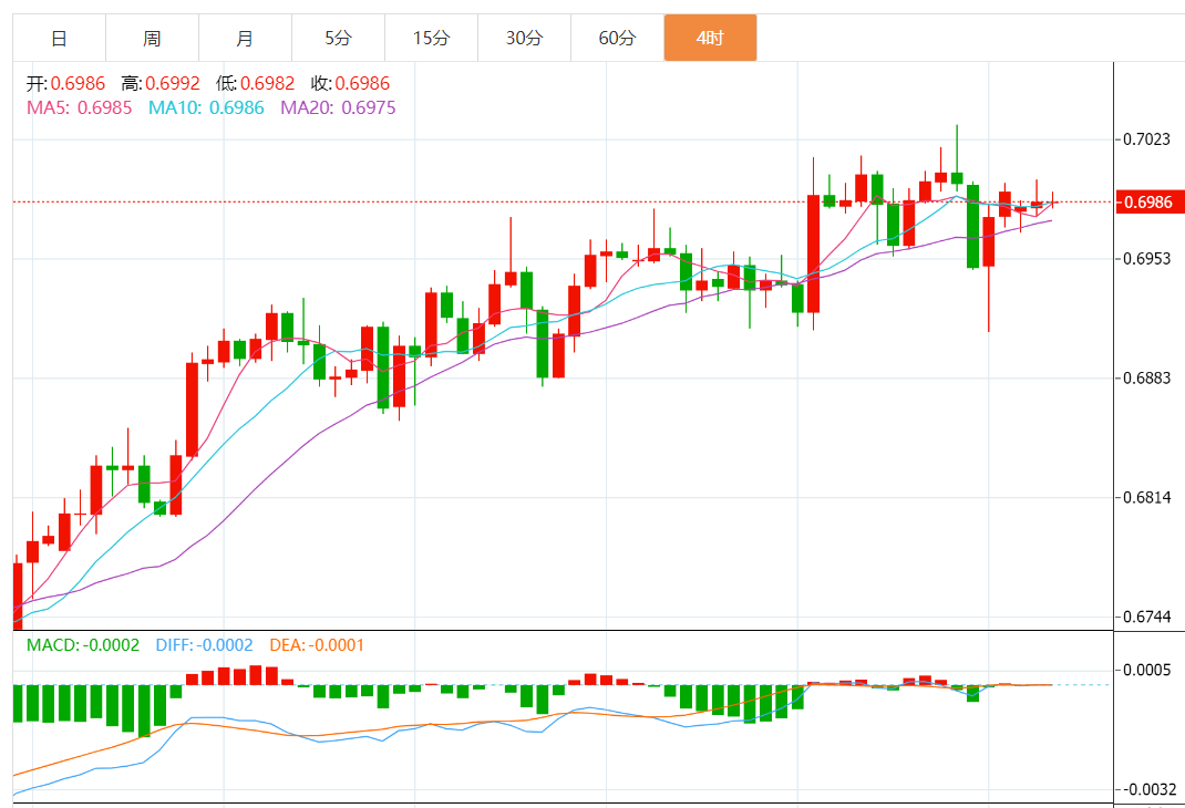 四小时图显示,澳元/美元在过去几天一直处于看涨趋势。该货币对已移至50% 斐波纳契回撤位。它也突破了 25 天和 50 天移动平均线,而相对强弱指数 (RSI)也突破了 50 的中性点。因此,随着多头瞄准下一个关键阻力位 0.7100,该货币对可能会继续上涨。跌破支撑位 0.6900 将使看涨观点无效。