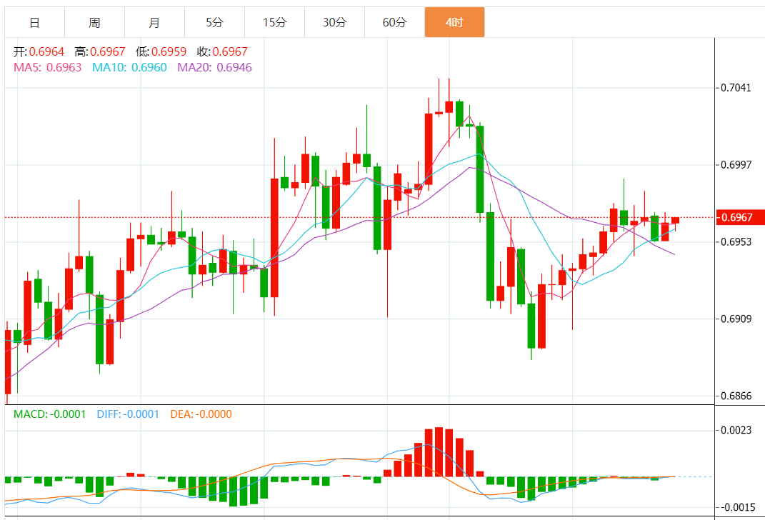 4小时图显示,澳元/美元在 6 月高点0.7283 到7 月14 日低点0.6707)趋势的50%斐波位0.6983附近面临阻力。汇价处在技术形态内。澳元/美元将整理于0.6890-0.7045区间。