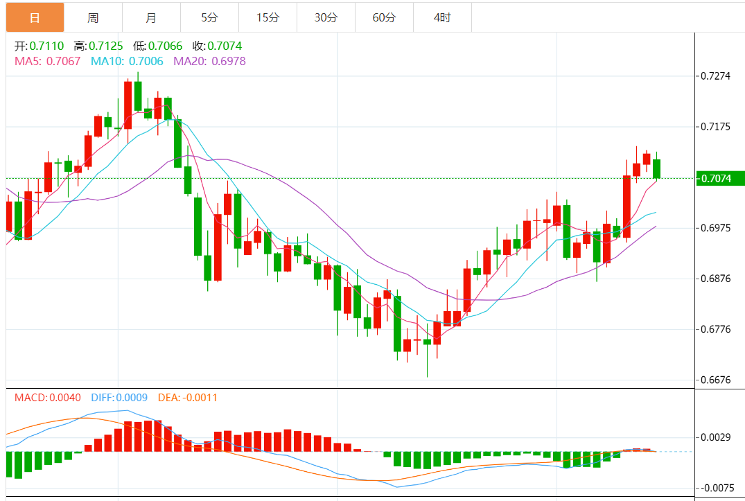 技术上,澳元兑美元在前几个交易日显示横盘整理,受随机负面影响,有望实现预期的暂时下跌,目标可能是测试关键支撑位 0.7050,然后再次回升。
