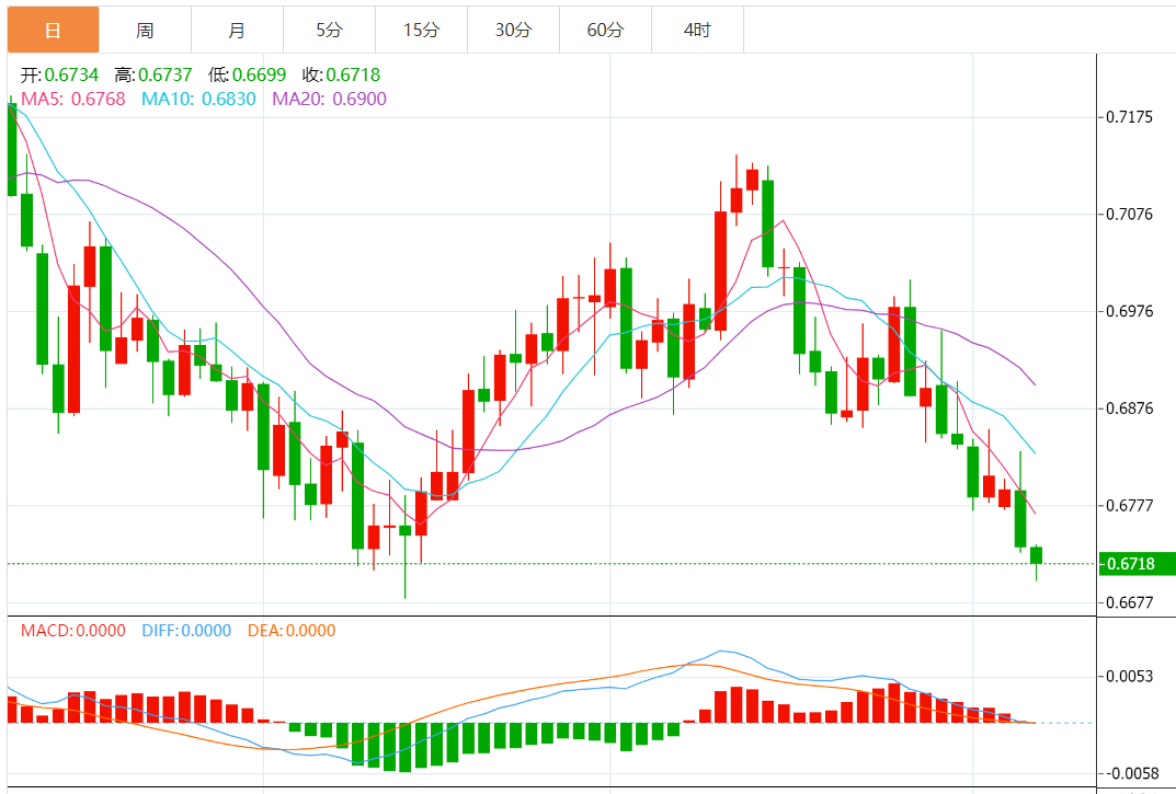 在 0.6770 设置买入止损,在 0.6900 设置止盈。