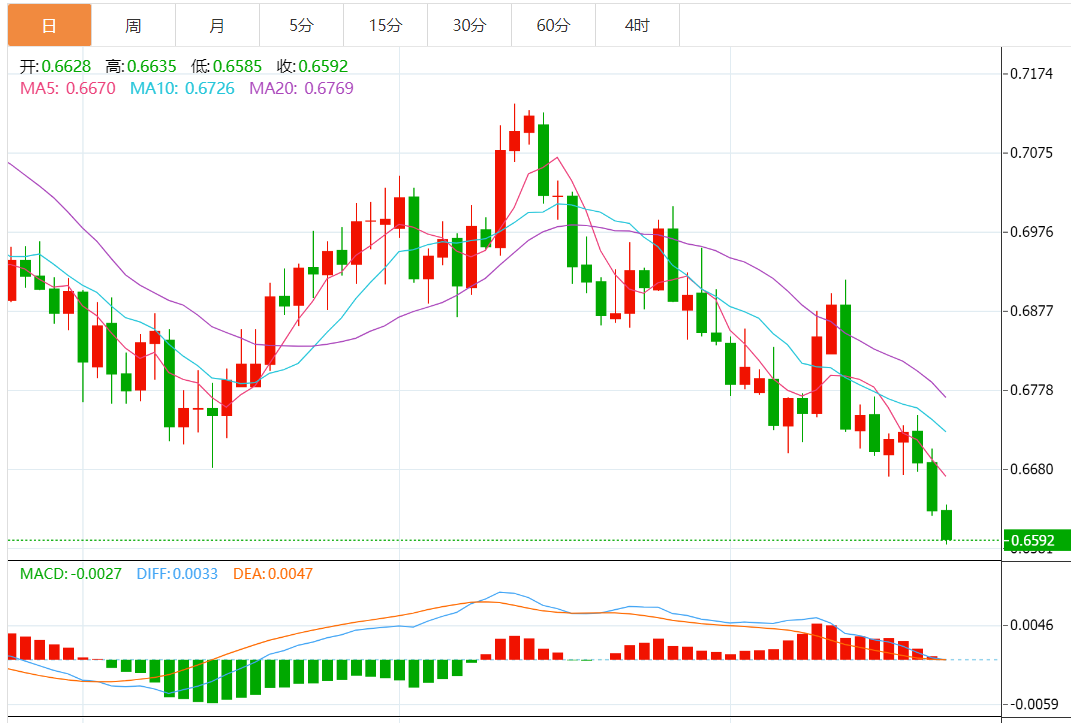 技术上,澳元仍有可能进一步走软,但超卖状况可能首先导致盘整。在过去几天的盘整之后,短期下行势头正在再次形成。RSI和MACD看跌以及四个月下降通道形态也增强了澳元的看跌倾向。汇价将测试上述通道的支撑线0.6560附近。4-8月波段的61.8%斐波延展回档位接近0.6535,也构成支撑位。