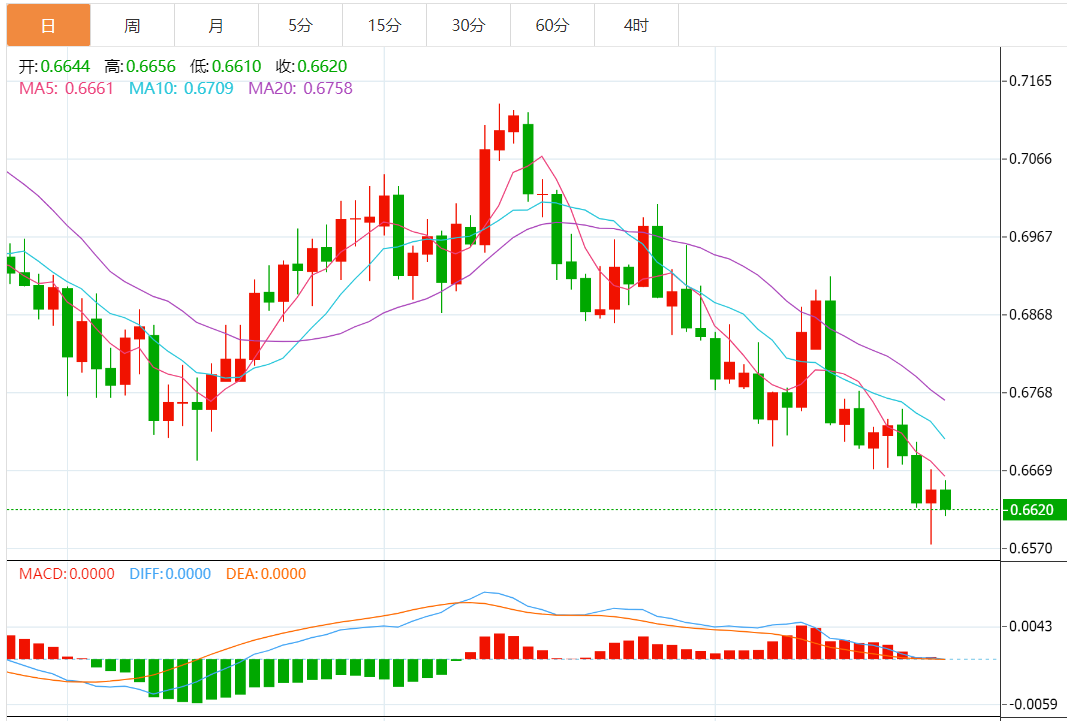 澳元/美元已跌破20 周期指数均线0.6635,进一步打压多头。此外,相对强弱指标(14) 即将跌至20.00-40.00 看跌范围,引发澳元/美元下跌倾向。