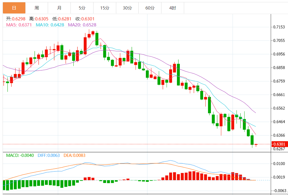 不过应该注意的是,汇价持续交投于9月20日至10月4日期间波段的61.8%斐波延展回档位和10日MA均线下方也限制汇价立即上行,它们分别位于0.6300和0.6430附近。