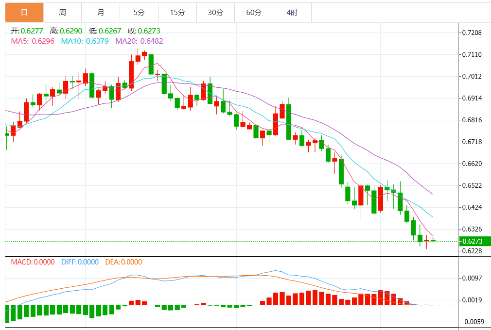 技术上,在日线级别上,若澳元/美元跌破盘整区间0.6369-0.6545后直线下跌。这导致波动性上升、交易量大增以及价格大幅波动。下降的20和50EMA均线分别位于0.6487和0.6661,增加下行压力。