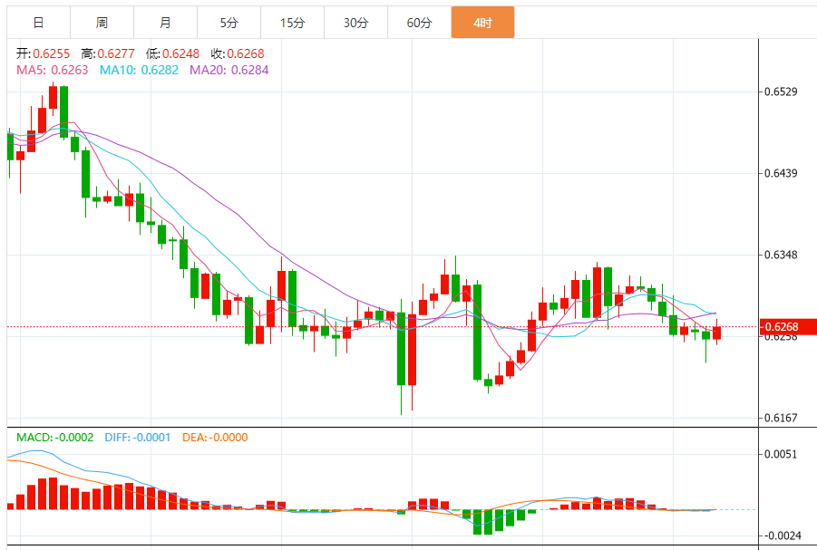从4小时图显示,澳元/美元跌至首个目标0.6165的道路已经打开,跌破这一水平将是该货币对跌向下一目标0.6090的关键因素。因此,除非澳元/美元反弹突破0.6320及0.6400,且维持在这些水平上方,否则我们将继续预测该货币对处于看空趋势。预计今日澳元/美元交投将位于支撑位0.6170以及阻力位0.6280之间。