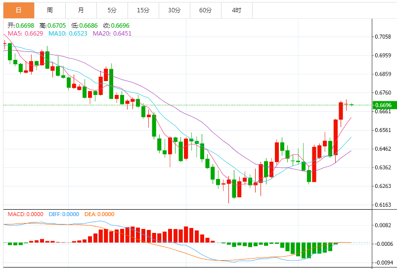 技术上,日图显示澳元兑美元构筑W形态,这是本週澳元兑美元的关键技术特征。这是一个反转形态,预计价格将在适当的时候介入该形态颈线。 61.8斐波位处在颈线处,澳元兑美元第一目标是38.2%斐波位0.66关口下方。