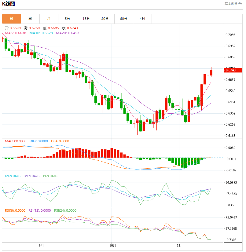 澳元继续上涨,今天早些时候触及两个月高位。欧洲时段,澳元/美元报0.6756,上涨0.85%。