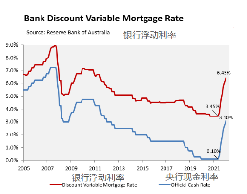 澳洲统计局数据显示截至9月份,工资增长了3.1%,这是自2013年3月以来最强劲的年度增长。但以上指标存在滞后性,澳洲央行连续加息的后果还没有完全反应出来。随着家庭消费的恶化,明年的经济发展危机四伏。现在浮动抵押贷款利率已经升至2012年4月以来的最高水平,澳洲央行称抵押贷款偿还总额将上升至家庭可支配收入的9%左右,超过12年前的最高纪录。这个持续趋势可能最终在2023年导致家庭常规消费模式崩溃。