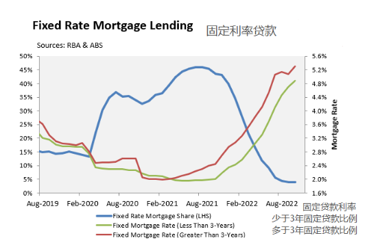 基于这些预测,2023年官方现金利率将从目前3.10%的水平再上升0.25%至0.75%。与首次加息前2022年4月的利率相对,抵押贷款持有人平均浮动抵押贷款还款额将比紧缩前的水平上升45%至52%,50万澳元的抵押贷款每月还款额将增加995至1163澳元。更糟糕的是,在疫情期间,申请固定利率抵押贷款的澳大利亚购房者比例从长期平均水平约15%飙升至2021年年中创纪录的46%。