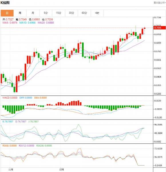 交易策略:预计今日澳元/美元交投将位于支撑位0.6975以及阻力位0.7100之间。