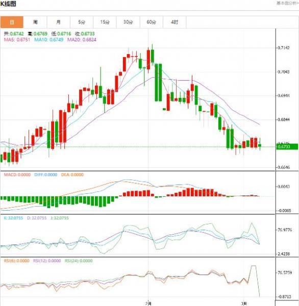 交易策略:可以在0.6790---0.6735的区间下限买入,有效破位35个点止损,目标在区间的上限。